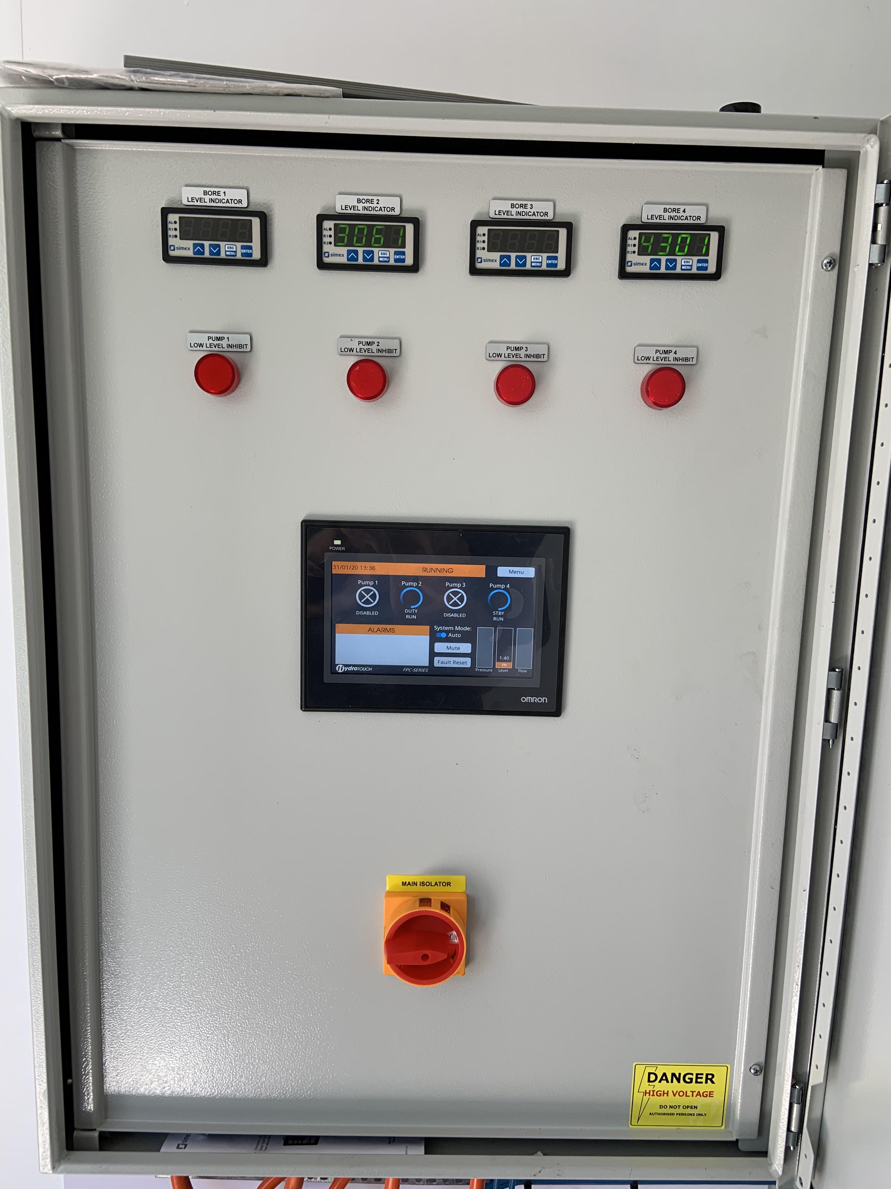 Upon upgrading 4 bore pumps for a large island resort we designed and had built this custom controller to meet the demands and monitoring requirements for QLD health and Brisbane City Council. This Panel provides